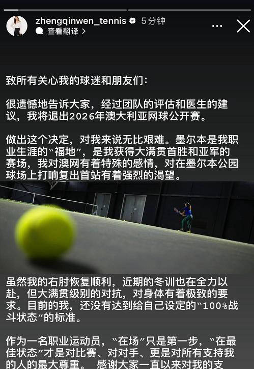 令人遗憾的是,复出后的郑钦文因过早恢复比赛,最终导致伤势加剧,接下来的武网、宁波站以及全运会等大型赛事均未能参加,只能专注于康复训练。即便如此,她的伤势依旧没有彻底痊愈,冬训期间虽然状态有所提升,但仍未达到理想的健康水平。因此,郑钦文不得不作出放弃澳网的无奈选择。